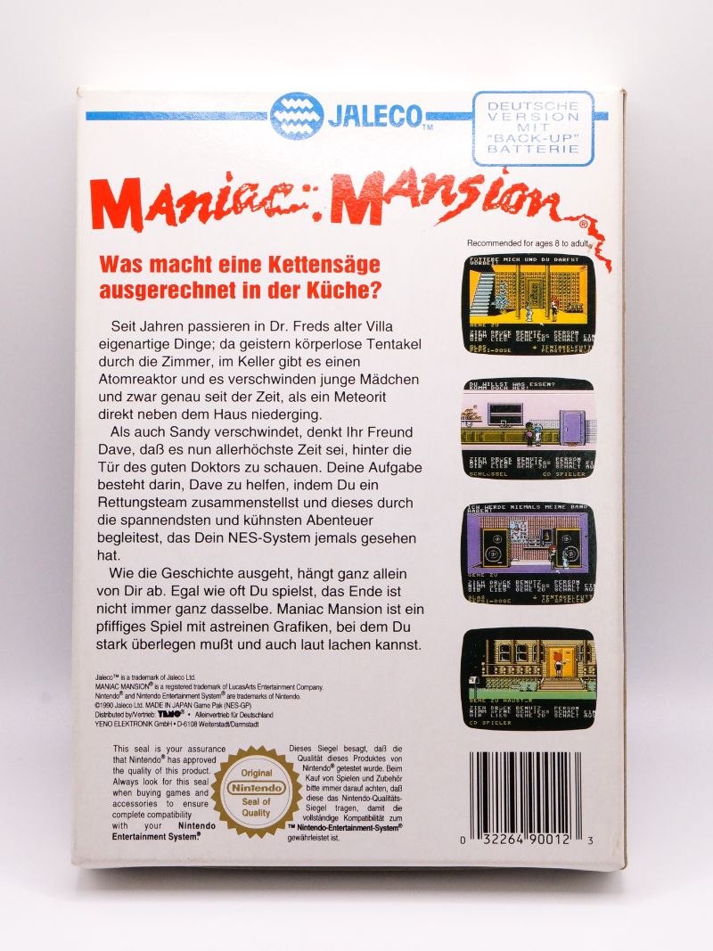 "Maniac Mansion" auf dem NES ist nicht nur ein klassisches Videospiel, sondern auch ein Meilenstein in der Geschichte der Videospielindustrie. Die einzigartige nicht-lineare Erzählweise, der Humor, die Grafik und der Sound haben dazu beigetragen, dass dieses Spiel über Jahrzehnte hinweg begeisterte Fans gefunden hat. Wenn Sie ein Retro-Gaming-Enthusiast oder Sammler sind, darf "Maniac Mansion" in Ihrer Sammlung nicht fehlen. Bestellen Sie noch heute Ihre Kopie und tauchen Sie in die Welt dieses zeitlosen Klassikers ein, der auch nach all den Jahren nichts von seinem Charme verloren hat.